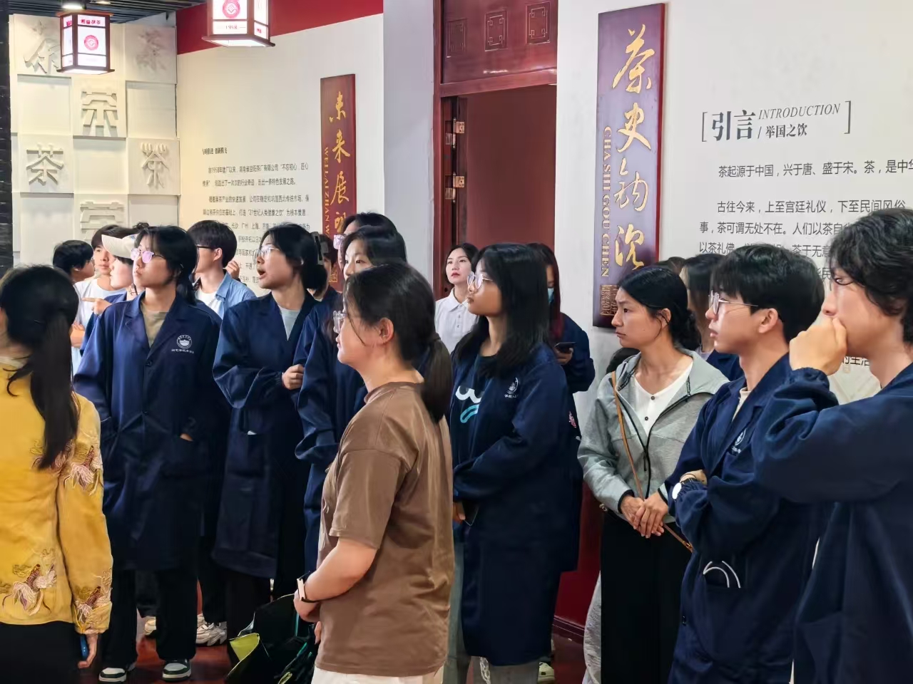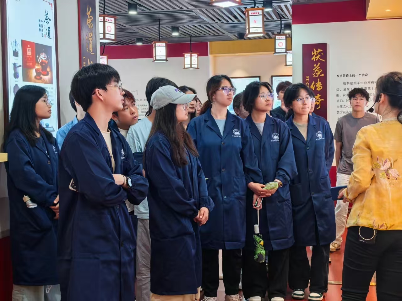 師生們首先實地參觀了湘益生產(chǎn)線與茶博館。在生產(chǎn)車間,同學們親身感受益陽茶廠標準化、現(xiàn)代化的生產(chǎn)流程,對茯磚茶的制作工藝有了初步直觀的了解。茶博館內(nèi)陳列的一件件展品,則如同一部生動的茶文化史書,讓師生們沉浸式領(lǐng)略益陽茶廠深厚的文化底蘊,探尋茯茶的前世今生,深刻體會 “一片茶葉承載的使命”。