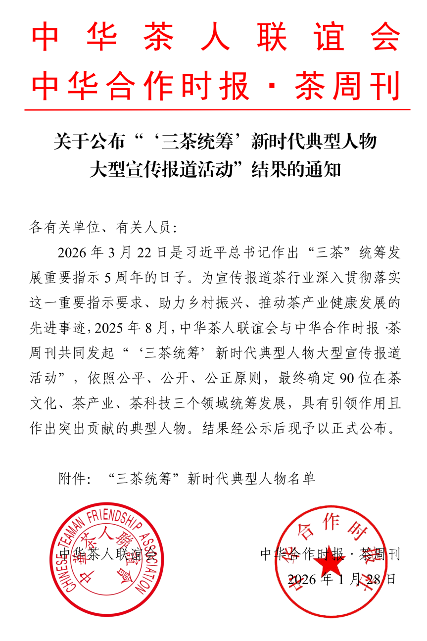 近日,由中華茶人聯(lián)誼會與中華合作時報·茶周刊共同主辦的 “‘三茶統(tǒng)籌’新時代典型人物大型宣傳報道活動” 評選結果正式揭曉。公司總經(jīng)理余智勇,憑借其在推動茯茶產(chǎn)業(yè)高質量發(fā)展、深入踐行“三茶統(tǒng)籌”發(fā)展理念方面的突出貢獻,光榮入選。