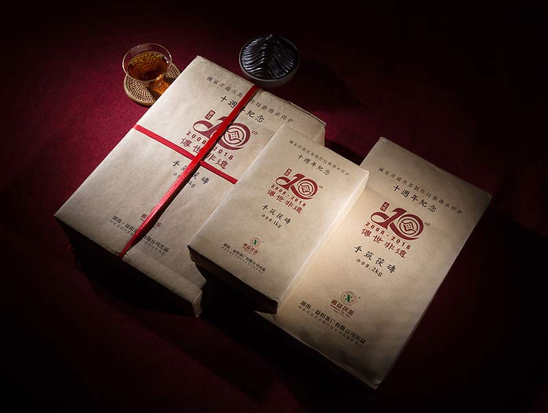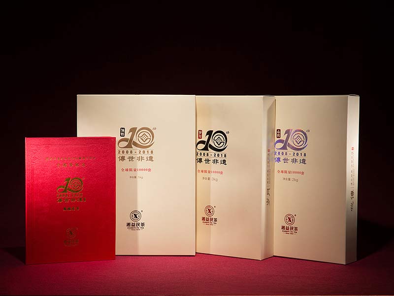 此款組合紀念茶限量收藏禮盒套裝為隆重紀念茯磚茶制作技藝列入國家非物質文化遺產(chǎn)保護名錄十周年包含“歲月3kg”、“心傳2kg”、“領悟1kg”三塊精制手筑茯磚,每套均有劉杏益大師親筆簽名,并配備有獨立收藏編號的典藏證書,共10000套,收藏品飲價值皆宜。
