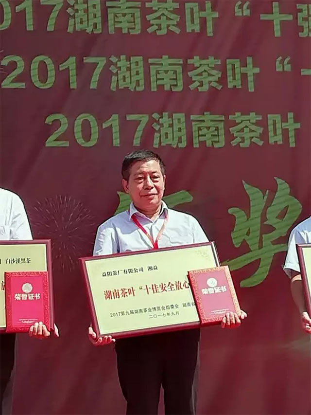 開幕式上,湖南省人民政府政協(xié)副主席戴道晉宣布第九屆湖南“茶博會(huì)”開幕。省領(lǐng)導(dǎo)為榮獲“2017湖南茶葉‘十佳安全放心品牌’‘十強(qiáng)生態(tài)產(chǎn)茶縣’‘十佳茶旅景區(qū)’”單位授牌頒獎(jiǎng)。湘益茯茶榮獲湖南茶葉“十佳安全放心品牌”榮譽(yù)稱號(hào),公司副總經(jīng)理、國(guó)家非遺茯磚茶技藝代表性傳承人劉杏益先生上臺(tái)領(lǐng)獎(jiǎng)。